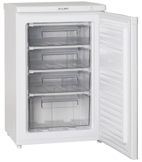Малогабаритная модель с полезным объемом камеры 85 л, которая может послужить хорошим выбором для владельцев квартир с небольшой площадью. Морозильному шкафу присвоен класс энергопотребления A+, что говорит об экономном расходе электроэнергии. Так, работая в постоянном режиме устройство потребляет около 177 кВт*ч в год — такой показатель практически никак не отражается на ежемесячных счетах за энергоноситель. Морозильная камера Atlant M 7401-100 оснащена одним глубоким и тремя стандартными ящиками, выполненными из прозрачного пластика. Большой бокс находится в самом низу и предназначен для хранения габаритных продуктов, остальные имеют одинаковые размеры и расположены выше. Все ящики оснащены удобными ручками и легко выдвигаются. Для управления техникой предусмотрена классическая панель управления, состоящая из поворотных переключателей, которые отличаются высокой надежностью и простотой в эксплуатации. В случае неисправности устройства или прекращения подачи электроэнергии продукты будут находиться в благоприятных для безопасного хранения условиях еще в течение 10 часов, что обеспечивается хорошей теплоизоляцией техники. Морозильная камера принадлежит к климатическому классу N-ST, что позволяет использовать ее при температуре +16…+38 °С.