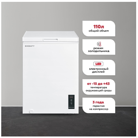 Мощность заморозки Kraft BD(W)-100BL составляет 4,5 кг/сутки. При отключении света морозильный ларь сохраняет низкую температуру в морозильной камере до 17 часов. При активации режима «Суперзаморозка» температура в камере достигает -30°C. Низкий уровень шума не превышает 38 дБ. Рекомендуемый диапазон температур эксплуатации ларя от +10 до +43°С.