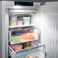 Морозилка оснащена вместительными ящиками с прозрачными стенками, облегчающими поиск нужных продуктов. Двойные ручки и направляющие с небольшими колёсами ускоряют их выдвижение.
