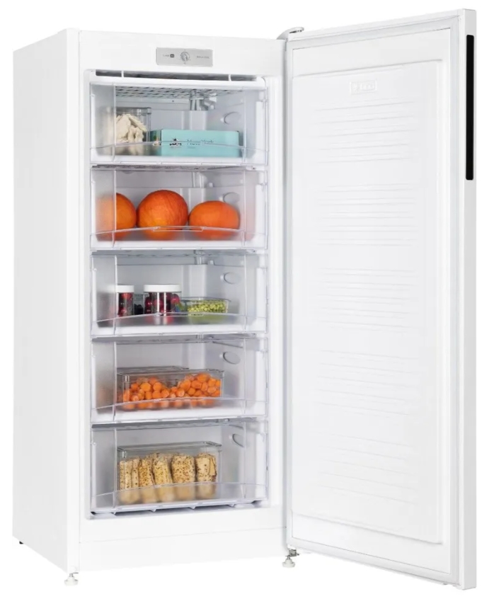 Морозильник белого цвета с черной интегрированной ручкой и продуманным внутренним пространством станет стильным и технологичным акцентом на вашей кухне. Высота устройства 1,287 м. Для комфортного открытия и установки морозильника в удобном месте — дверь можно перенавесить с правой стороны на левую.