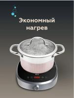 Магнитное поле плиты при контакте с металлом нагревает только посуду и передает тепло еде внутри. Сама же конфорка остается холодной, об нее невозможно обжечься или навредить себе. При снятии посуды с конфорки плита отключается в течение 1 минуты. Также в приборе предусмотрены защита от перегрева, останавливающая работу при достижении критических температур, и защита от детей.
