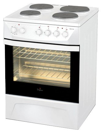 Особенности Плита электрическая с 4 чугунными электроконфорками, стиль панорамный объемный, терморегулятор, пятипозиционный переключатель режимов жарочного шкафа, ступенчатые переключатели режимов работы электроконфорок, освещение, выдвижной ящик, регулируемые опоры.