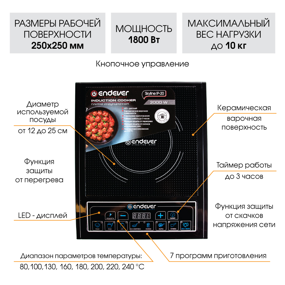 ЭКОНОМИЧНОСТЬ. Индукционная плитка Endever Skyline IP-20 потребляет в несколько раз меньше электроэнергии, чем обычная электрическая, за счет того, что конфорка автоматически подстраивается под диаметр дна посуды и нагревает только необходимую площадь. Она экономит не только энергию, но и Ваше время. За счёт большой мощности (2000 Вт) быстро нагревается и постоянно поддерживает необходимую температуру, что значительно сокращает время приготовления пищи.