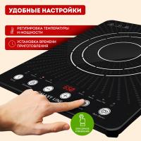 Плитка оснащена сенсорным управлением, которое позволяет легко и точно настраивать температуру в диапазоне от 80 до 270 °C, мощность от 200 до 2000 Вт, а также время приготовления. Благодаря этим настройкам вы сможете приготовить блюда любой сложности с максимальной точностью.