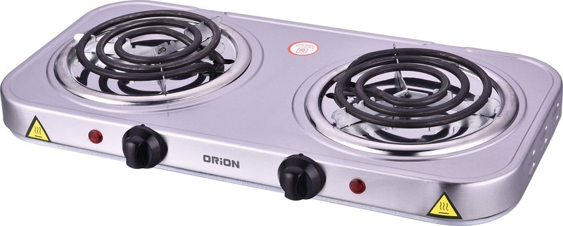 Плитка электрическая Orion OH-210 выполнена в корпусе из высококачественной нержавеющей стали и имеет два спиральных нагревательных элемента. Мощность каждой конфорки диаметром 13 см составляет 1кВт. Модель прекрасно подойдет для использования как в квартире, так и на даче, благодаря своим компактным размерам.