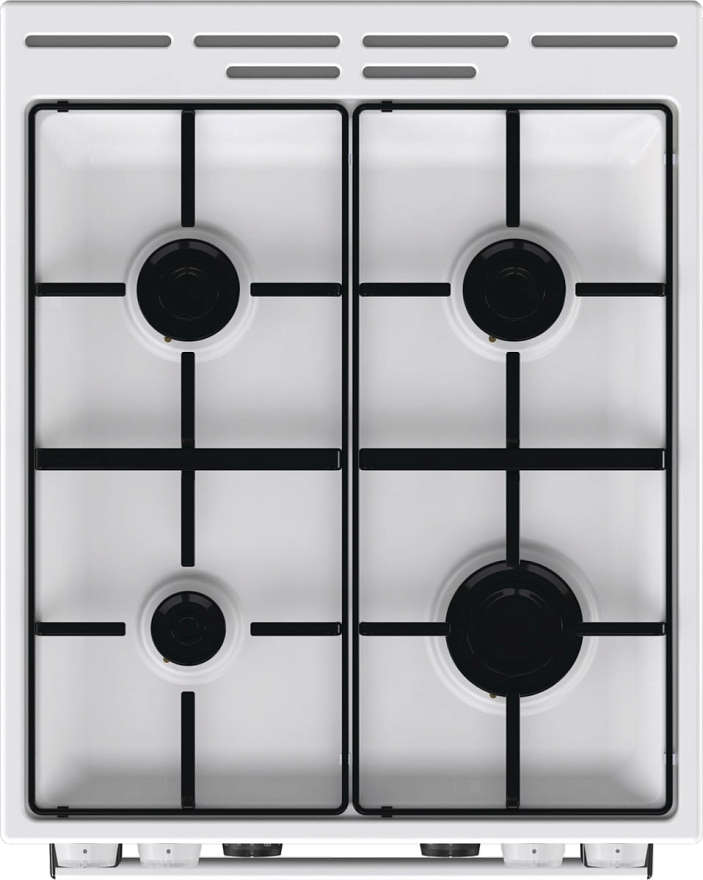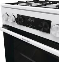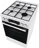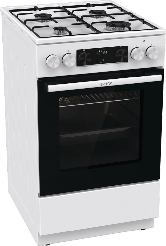 Комбинированная плита Gorenje GK5C60WJ выполнена в белом цвете. А её ширина составляет 50 см. Это позволит вписать устройство в скромные по габаритам пространства. Данная модель имеет классический белый цвет и вставки из чёрного стекла. Внизу расположен отсек для хранения посуды. В навигации участвуют поворотные переключатели и сенсорный программатор IconLED. Он отвечает за выбор режима выпекания и температуры, а также настройки таймера. Он готов не только сообщить при помощи звука, что время истекло, но и самостоятельно отключить духовой шкаф.