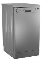 Элегантная посудомоечная машина серебристого цвета имеет класс энергоэффективности А, экономично расходует воду – до 10,5 л при каждом полном цикле – и работает с низким уровнем шума. При ширине всего 45 см посудомоечная машина вмещает до 10 полных комплектов посуды и предлагает 5 программ мытья, функцию отложенного старта на 3, 6 и 9 часов и возможность работы при половинной загрузке. Системы защиты от протечек и смягчения воды обеспечивают безопасную и долговечную работу посудомоечной машины.