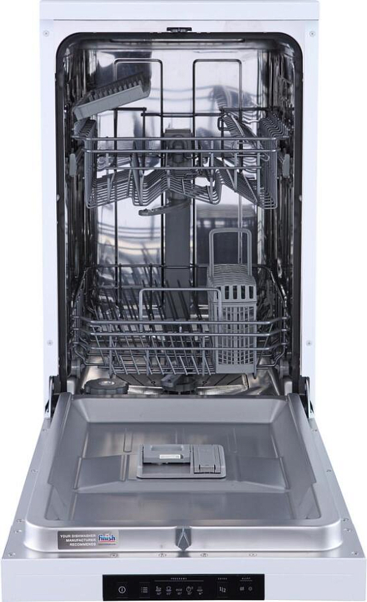 Посудомоечная машина Gorenje GS520E15W станет вашим надежным помощником в том, что касается мытья посуды. Это отдельностоящая модель, выполненная в белоснежном цвете и обладающая шириной всего 45 см. Несмотря на это, она способна вместить до 9 комплектов посуды, причем устройство ее корзин таково, что верхнюю можно переставлять по высоте, что позволяет размещать внутри предметы разных габаритов, а также предусмотрены складные фиксаторы, обеспечивающие возможность размещения крупных кастрюль и сковородок.