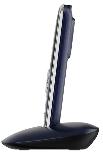 Телефон в классическом сдержанном дизайне с док-станцией, фонариком с включателем на боковой панели.