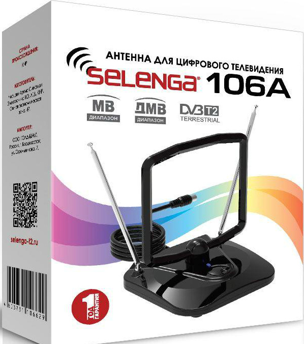 Антенна телевизионная комнатная SELENGA 106А с строенным усилителем (питание через антенное гнездо). Усиление: 12-28Дб, Рабочая частота: 47-862 МГц, Сопротивление: 75 Oм, Длина кабеля:1,5 метра