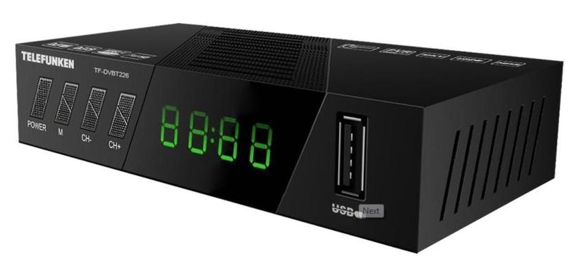 Приставка для цифрового ТВ Telefunken TF-DVBT226 поддерживает цифровые телевизионные стандарты DVB-C, DVB-T, DVB-T2, объемное звучание Dolby Digital, интерфейс USB 2.0.