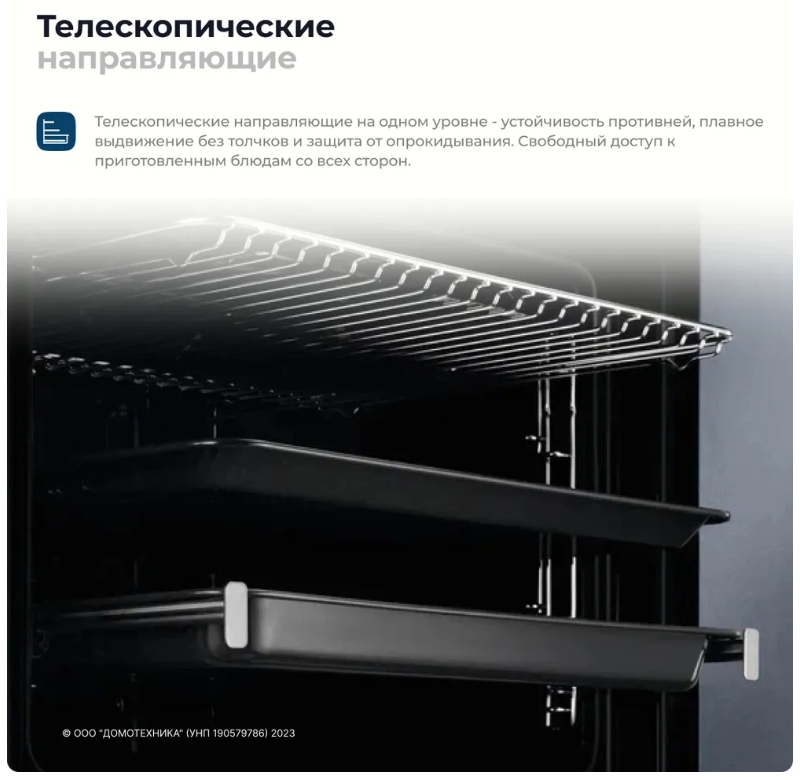 Телескопические направляющие на одном уровне – устойчивость противней, плавное выдвижение без толчков и защита от опрокидывания. Свободный доступ к приготовленным блюдам со всех сторон.
