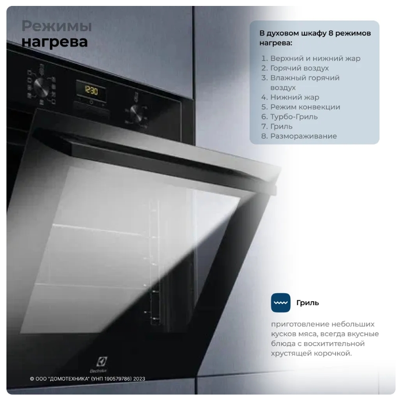 В духовом шкафу 8 режимов нагрева: Традиционное приготовление (верхний и нижний нагрев), Горячий воздух, Влажная конвекция, Нижний нагрев, Режим конвекции, Турбо-Гриль, Гриль, Размораживание.