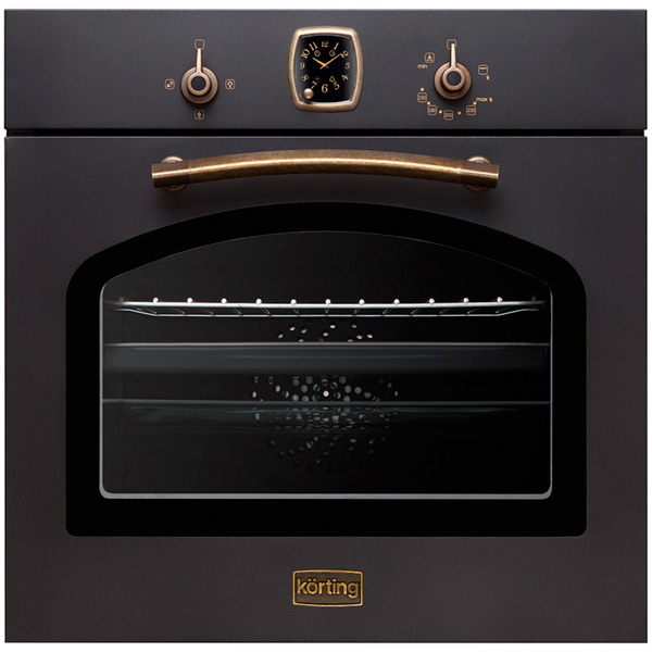 Газовый духовой шкаф Korting OGG 741 привлекает к себе внимание ретро-дизайном. С корпусом цвета слоновой кости контрастируют красиво изогнутая ручка-рейтинг и оригинальные поворотные регуляторы, выполненные под бронзу. Впечатление «старинного» прибора усиливают аналоговые часы и металлический шильд с названием бренда.