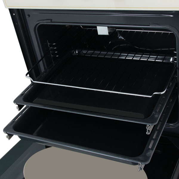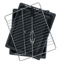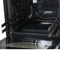 В духовке имеются телескопические направляющие на двух уровнях, благодаря чему доставать противень просто и безопасно. Модель укомплектована металлической решёткой и двумя противнями разной глубины.