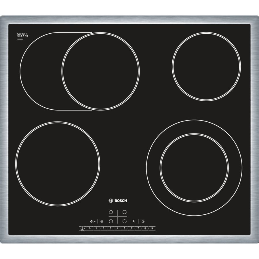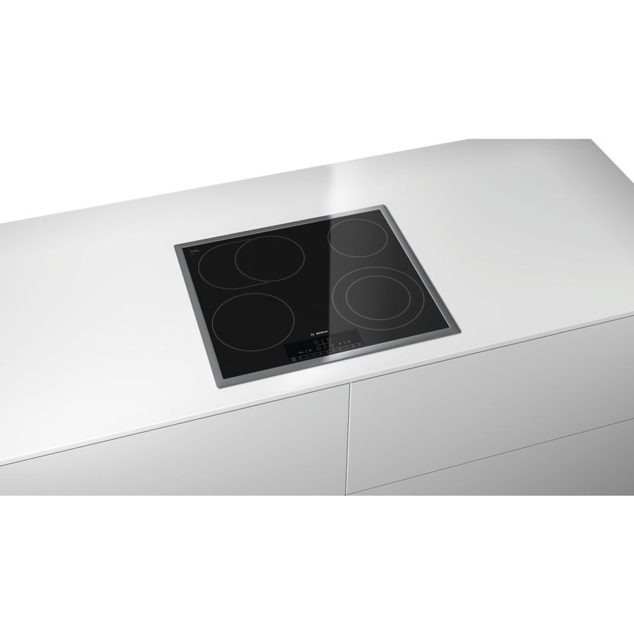 BOSCH PKN645F17R – брендовая и производительная варочная поверхность настоящего немецкого производства. В ней имеется четыре мощных электрических конфорки, а управление устройством реализовано через электронную сенсорную панель. Материал, из которого сделана рабочая поверхность – стеклокерамика. В модели варочной кухонной техники BOSCH PKN645F17R предусмотрен ряд дополнительных полезных функций. Для автоматизации работы имеется программируемый электронный таймер, а для максимальной безопасности, есть отдельные индикаторы оставшегося тепла для каждой конфорки и система блокировки от детей (предусмотрена и электроника закипания).