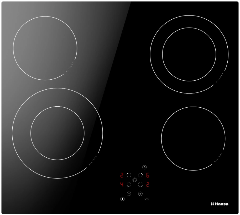 С электрической варочной поверхностью Hansa BHC66506 готовить самые разнообразные блюда – одно удовольствие. До 4 блюд одновременно позволит готовить эта поверхность, ведь в ней предусмотрены 4 конфорки размерами 120, 180, 145, 210 мм. Все 4 являются экспресс-конфорками, так что приготовления блюда займет у вас совсем немного времени. Из 9 уровней мощности рачительная хозяйка сможет выбирать подходящий. Порадует и тот факт, что и конфорки, и сама поверхность выполнены из стеклокерамики, стойкой к повреждениям и легко очищаемой.