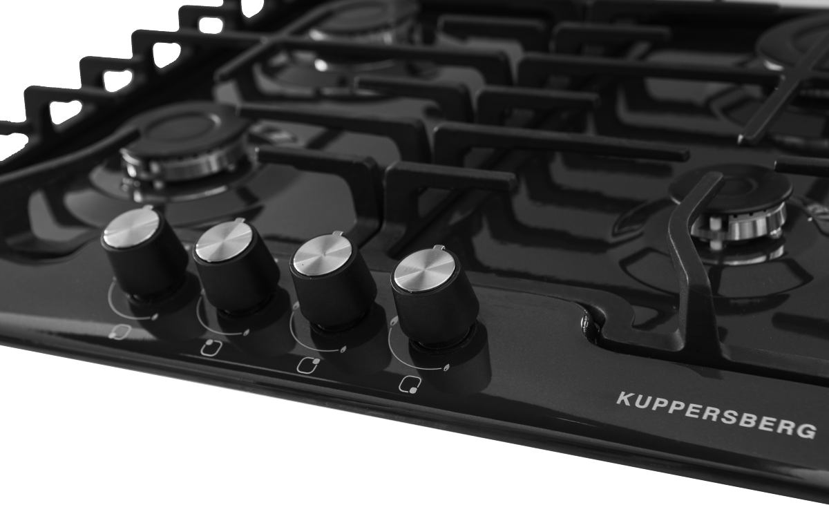 Лаконичность линий и элегантность—свойства газовой панели «Kuppersberg TS 61 B». Рабочий стол выполнен из выскокачественной нержавеющей стали, покрытой эмалью черного цвета, что придает надежность и простоту ухода за этой моделью. Панель оснащена системой «газ-контроль» — это система сработает в случае, если пламя случайно погаснет. Так же в ручки управления интегрирован электроподжиг — теперь можно забыть о спичках, достаточно повернуть ручку и пламя зажжется от искры. Две чугунные решетки придадут посуде дополнительную устойчивость