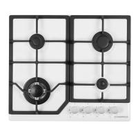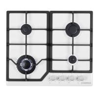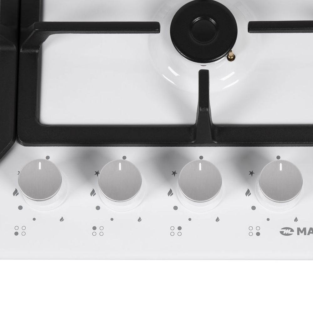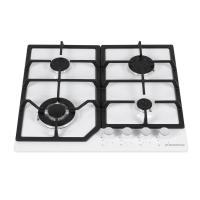 4 газовые итальянские конфорки:   3800,  1700, 1700, 1000 Вт. Фронтальное управление, 4 поворотных переключателя из высокопрочного термостойкого пластика с хромированными накладками, автоматический электроподжиг под ручкой управления, возможность работы от магистрального газа и газа в балоне (тип G30).