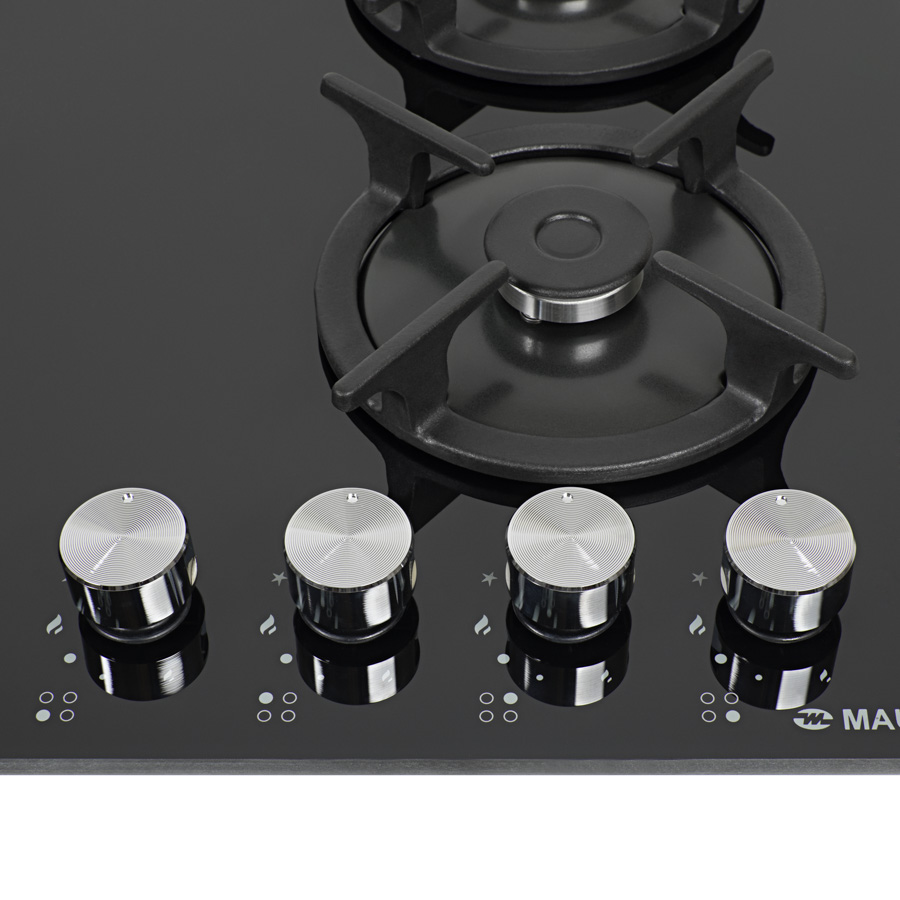 4 газовые турецкие конфорки:   2600,  1700, 1700, 1000 Вт. Фронтальное управление, 4 поворотных переключателя, автоматический электроподжиг под ручкой управления, возможность работы от магистрального газа и газа в балоне (тип G30).