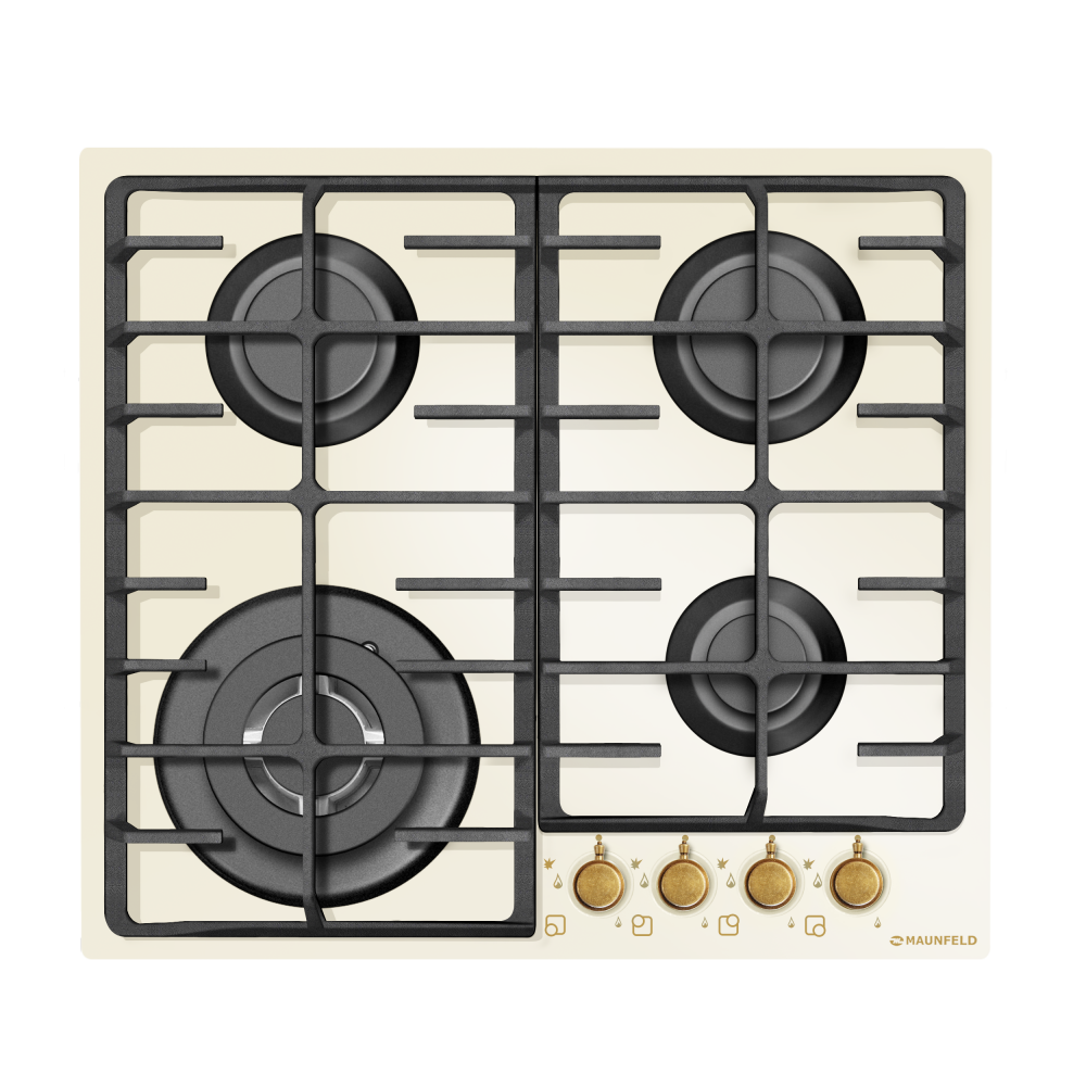 4 газовые итальянские конфорки SABAF: одна быстрая конфорка 3800W, две полу быстрые конфорки 1750W, одна дополнительная конфорка 1000W. Фронтальное управление, 4 круглых металлических поворотных переключателя (D35мм), автоматический электроподжиг под ручкой управления, возможность работы от магистрального газа и газа в балоне (тип G30).