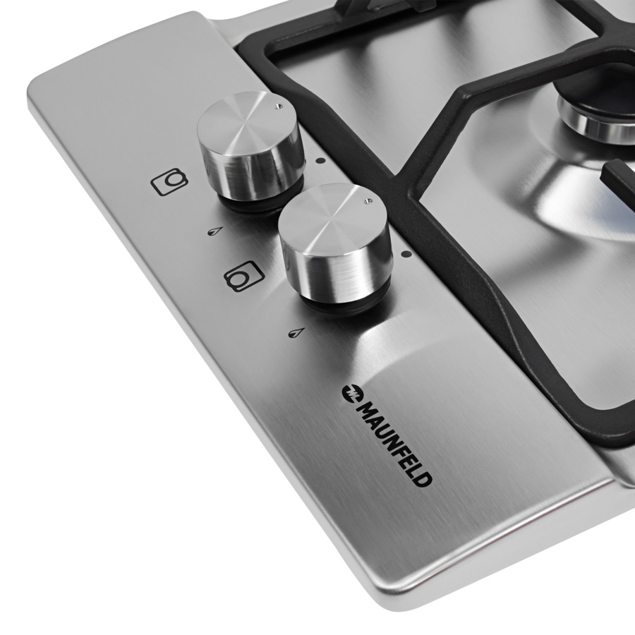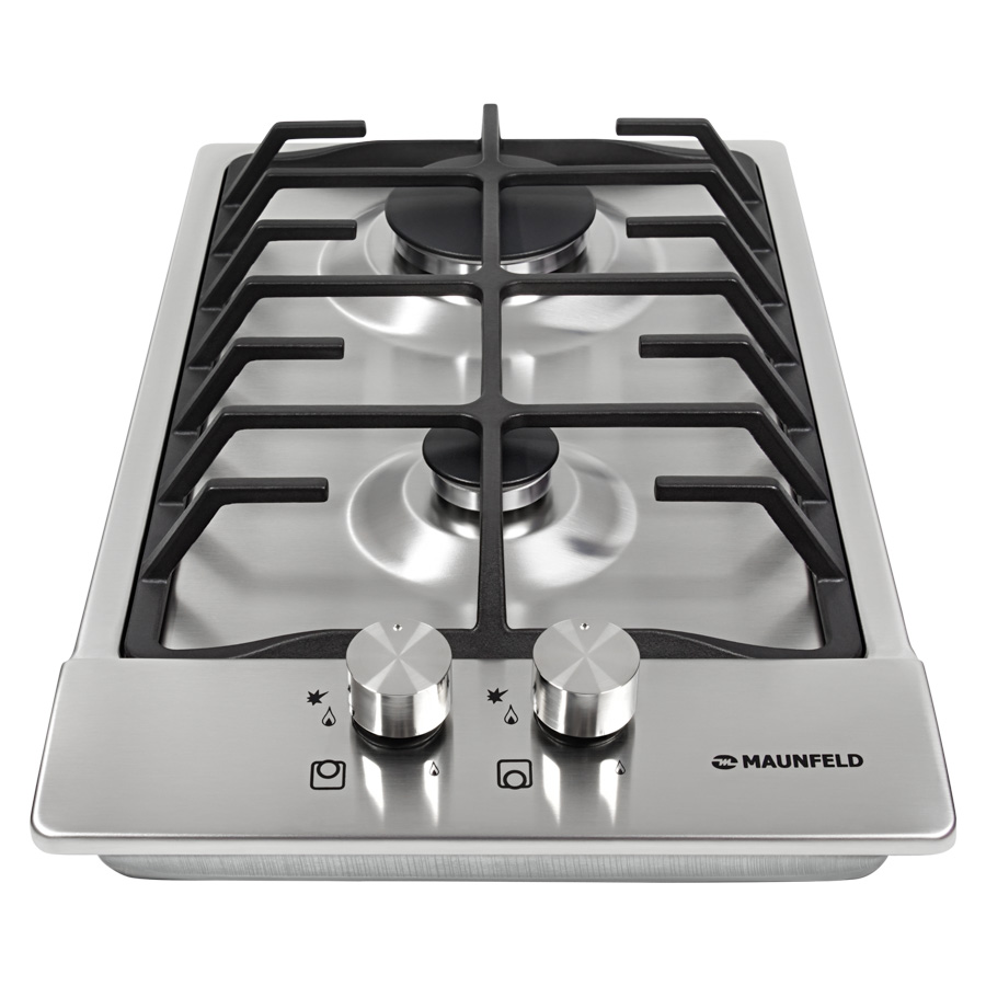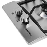 2 газовые итальянские конфорки SABAF: одна быстрая конфорка 3000W, одна дополнительная конфорка 1000W. Фронтальное управление, 2 круглых металлических поворотных переключателя (D35 мм), автоматический электроподжиг под ручкой управления, возможность работы от магистрального газа и газа в баллоне (тип G30).