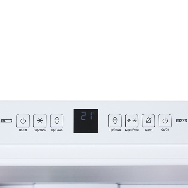 Электронное оформление осуществляется с помощью цифрового дисплея. Он информирует о том, что холодильник включён, показывает температуру в обеих камерах и позволяет её регулировать.