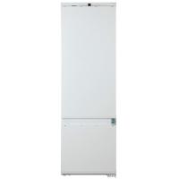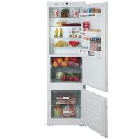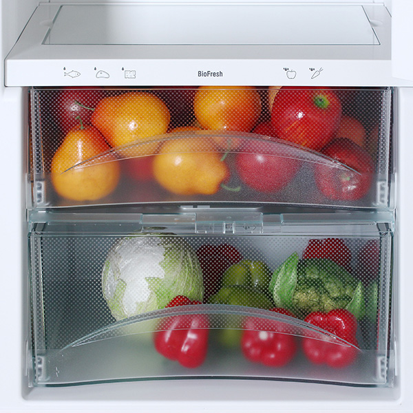 Встраиваемый холодильник чуть больше 1,7 метров в высоту и 0,5 метров в ширину. При таких размерах объём холодильной камеры составляет 208 литров, морозильной – 58 литров, зоны свежести – 68 литров. Всего встроены 2 камеры, морозильная находится снизу.