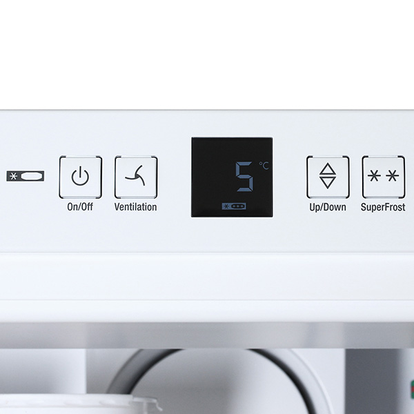 Электронное оформление осуществляется с помощью цифрового дисплея. Он информирует о том, что холодильник включён, показывает температуру в обеих камерах и позволяет её регулировать.
