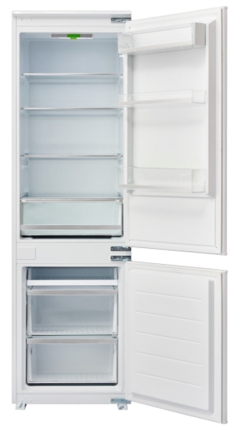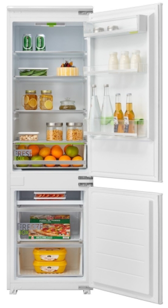 Холодильник компании Midea предназначается для интеграции в кухонную нишу размером 1776x560x550 мм. Этот 2-камерный агрегат с традиционной вертикальной компоновкой можно отнести к среднему классу устройств. Суммарный объем составляет 269 литров, включая 77 л, которые приходятся на морозилку. В этом отделении холодильника Midea MRI 7217 находятся три выдвижных полки. За сутки тут можно заморозить до 4 кг продуктов, а период сохранения холода при перебоях с электричеством составит 700 минут. Морозилка требует ручной разморозки, хотя благодаря функции Low Frost периодичность такого ухода должна быть нечастой. В 192-литровой холодильной камере поддерживается капельная технология оттаивания. Здесь предусмотрено четыре полки из закаленного стекла (три из них регулируются по высоте), а в нижней части находится выдвижной ящик с функцией контроля влажности, который стоит использовать для хранения овощей и фруктов. К другим особенностям агрегата относится наличие двух лотков для яиц и герметично закрывающейся дверной корзины. За год работы модель «намотает» на электросчетчике 280 кВтч (класс A+), а уровень шума способен достигать 39 дБ.