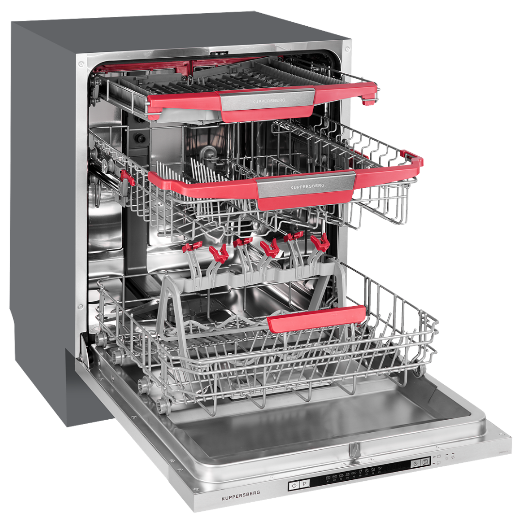 Старшие модели современных посудомоечных машин обычно имеет подсветку внутренней камеры. Это удобно при разгрузке посудомойки — вы сразу видите, что посуда идеально чистая, и ее можно отправить на полку. Kuppersberg GLM 6075 — продумана до мелочей.