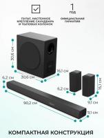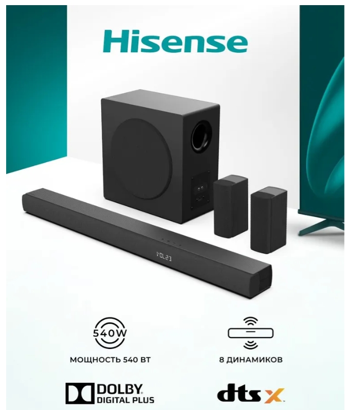 Полноценная 5.1-канальная система с 540 Вт мощности и 8 динамиками обеспечивает настоящее кинотеатральное погружение. Беспроводной 8-дюймовый сабвуфер и тыловые колонки создают объемный 3D-звук с технологиями Dolby Digital Plus и DTS Virtual:X.