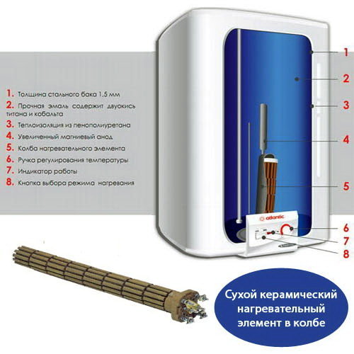 Технология "Steatit" - сухой" ТЭН, который погружен в  стальную эмалированную колбу обеспечивает быстрое равномерное прогревание и высокую производительность работы, это позволяет ограничить образование накипи тем самым  увеличивая срок эксплуатации прибора. Керамический «сухой» ТЭН быстро нагревается и медленно остывает, что существенно снижает энергозатраты.