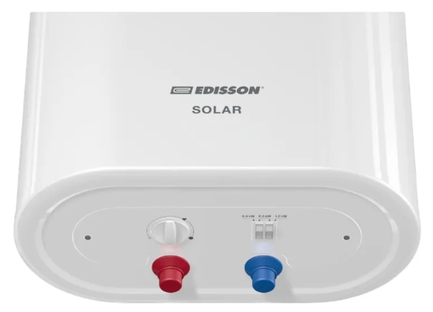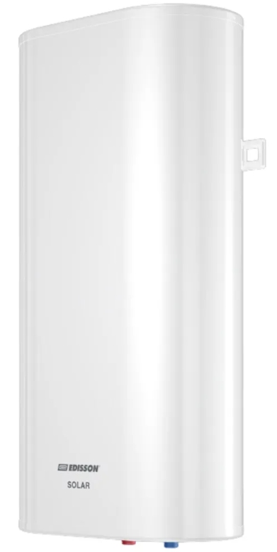 Внутренний бак изготовлен из нержавеющей стали. Пространство между внешним корпусом и внутренним баком заполнено пенополиуретаном - современной, экологически чистой теплоизоляцией, обладающей наилучшими характеристиками теплосбережения. Модели EDISSON Solar 30 V, Solar 50 V, Solar 80 V и Solar 100 V имеют два резьбовых патрубка: для входа холодной воды с синим кольцом и выхода горячей воды 2) - с красным кольцом. На съемном фланце смонтированы: трубчатый электронагреватель (ТЭН), термостат и магниевый анод. ТЭН служит для нагрева воды и управляется термостатом, который установлен на +75°С. Термовыключатель служит для предохранения ЭВН от перегрева и отключает ТЭН от сети при превышении температуры воды свыше +95°С