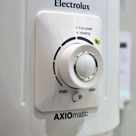 На панели управления водонагревателя EWH 80 AXIOmatic, нажав на специальную кнопку, можно выбрать функцию половинной мощности. Она позволяет экономить электроэнергию и использовать прибор в помещениях с ограниченной мощностью сети, например на даче. Установив полную мощность, включается функция быстрого нагрева до заданной температуры.