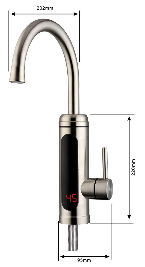 Вода нагревается практически мгновенно, протекая через колбу с электронагревателем. Водонагреватель оснащен индикатором нагрева и включения и LED дисплеем, на котором отображается уровень температуры воды.