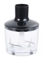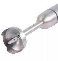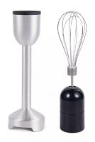 Ручной блендер с металлической погружной частью, восемью скоростными режимами работы с плавной регулировкой, мерным стаканом для точного соблюдения рецептуры, измельчителем и  насадкой-венчиком для взбивания.
