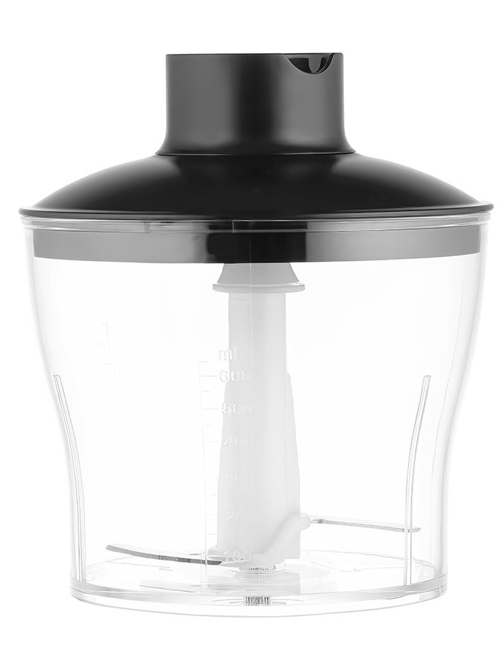 Погружной блендер с острыми ножами из нержавеющей стали обеспечит однородную текстуру без комочков. Венчик взобьет продукты за считаные секунды. Многофункциональная чаша-чоппер объемом 600 мл предназначена для шинковки и измельчения. В комплект также входит стакан с мерной шкалой из экологичного пластика объемом 800 мл.