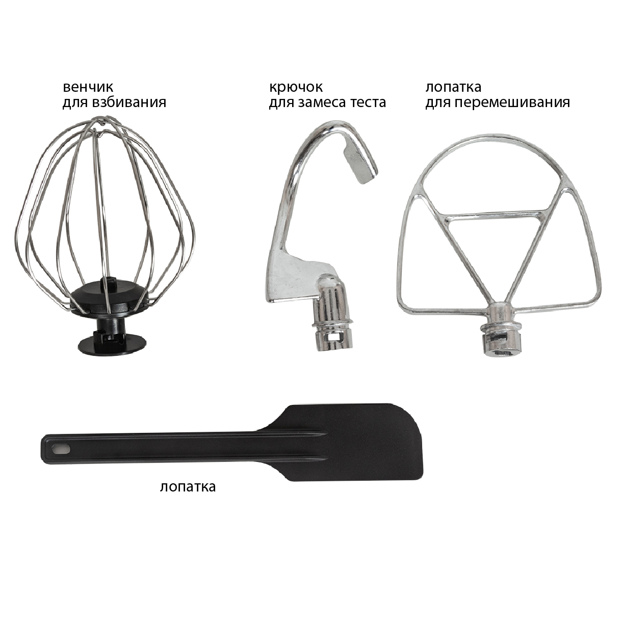 венчик для взбивания, лопатка для перемешивания, крючок для замеса теста