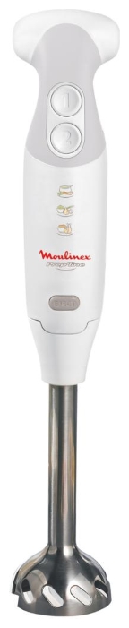 Погружной блендер Moulinex DD725130 мощностью 700 Вт обладает 2 скоростями и прекрасно подходит для измельчения или взбивания различных продуктов. Также есть прорезиненная рукоятка, настенный держатель, мини-измельчитель, мерный стакан на 0,8 литров и венчик для взбивания.