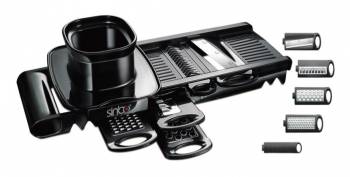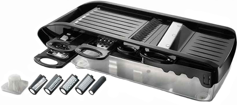 Описание Ручная терка-измельчитель для нарезки овощей и фруктов. Комплектуется удобным держателем, пятью сменными лезвиями и прозрачным пластиковым контейнером.
