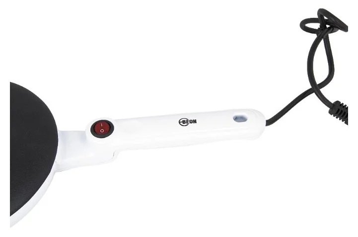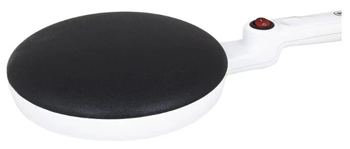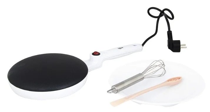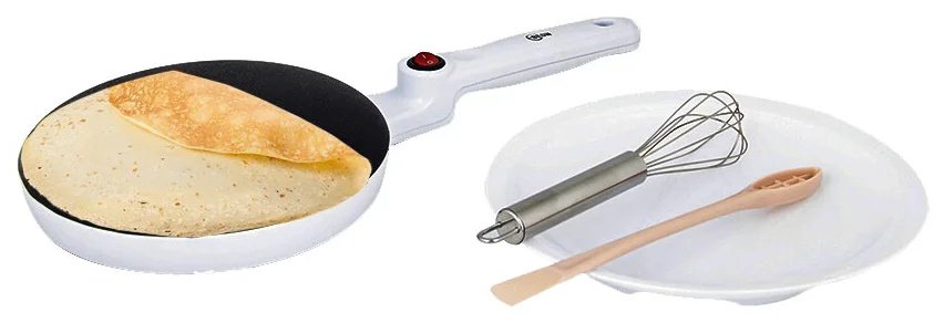 Погружная блинница с антипригарным покрытием рабочей поверхности, индикатором сети и аксессуарами для приготовления (пластиковая тарелка, венчик, лопатка).