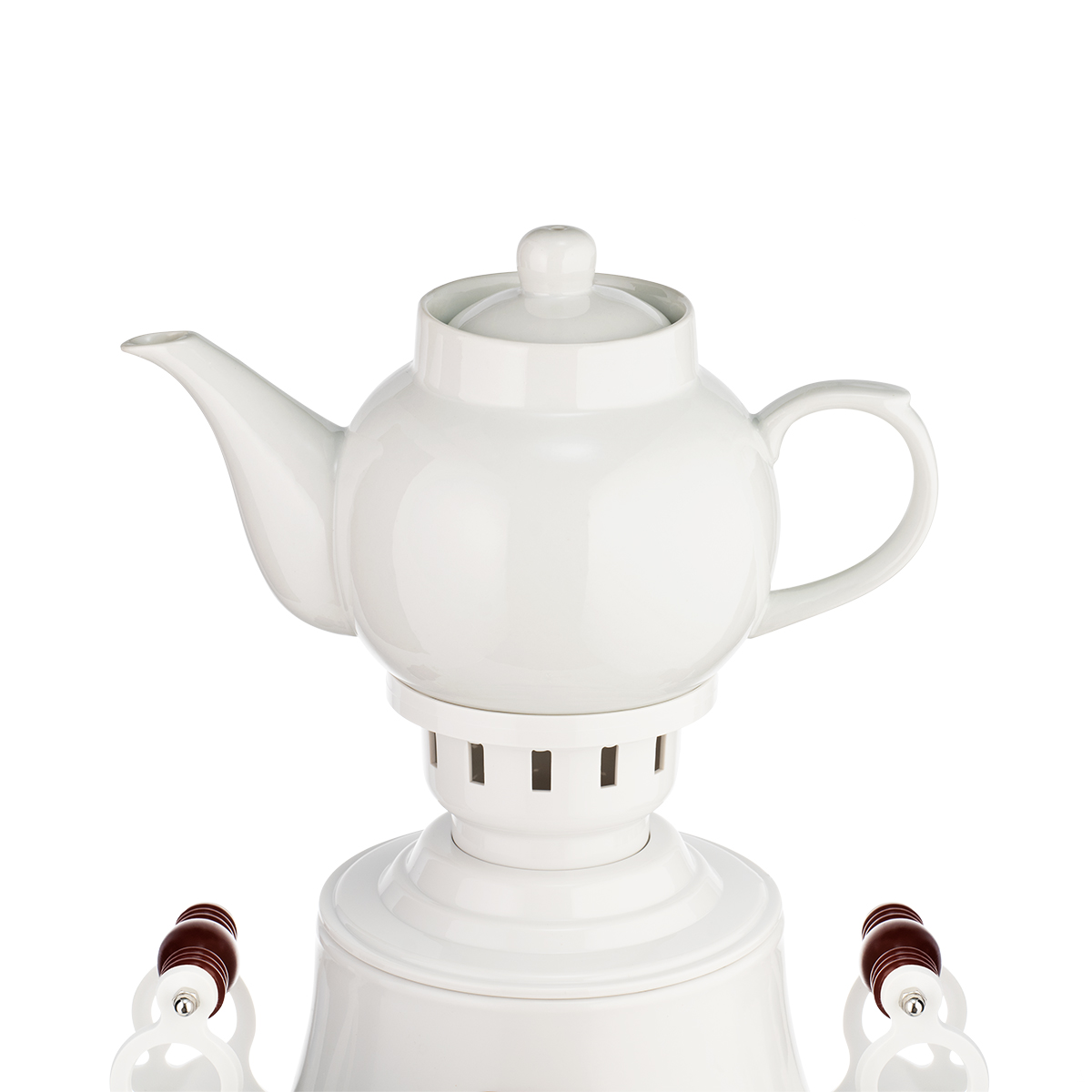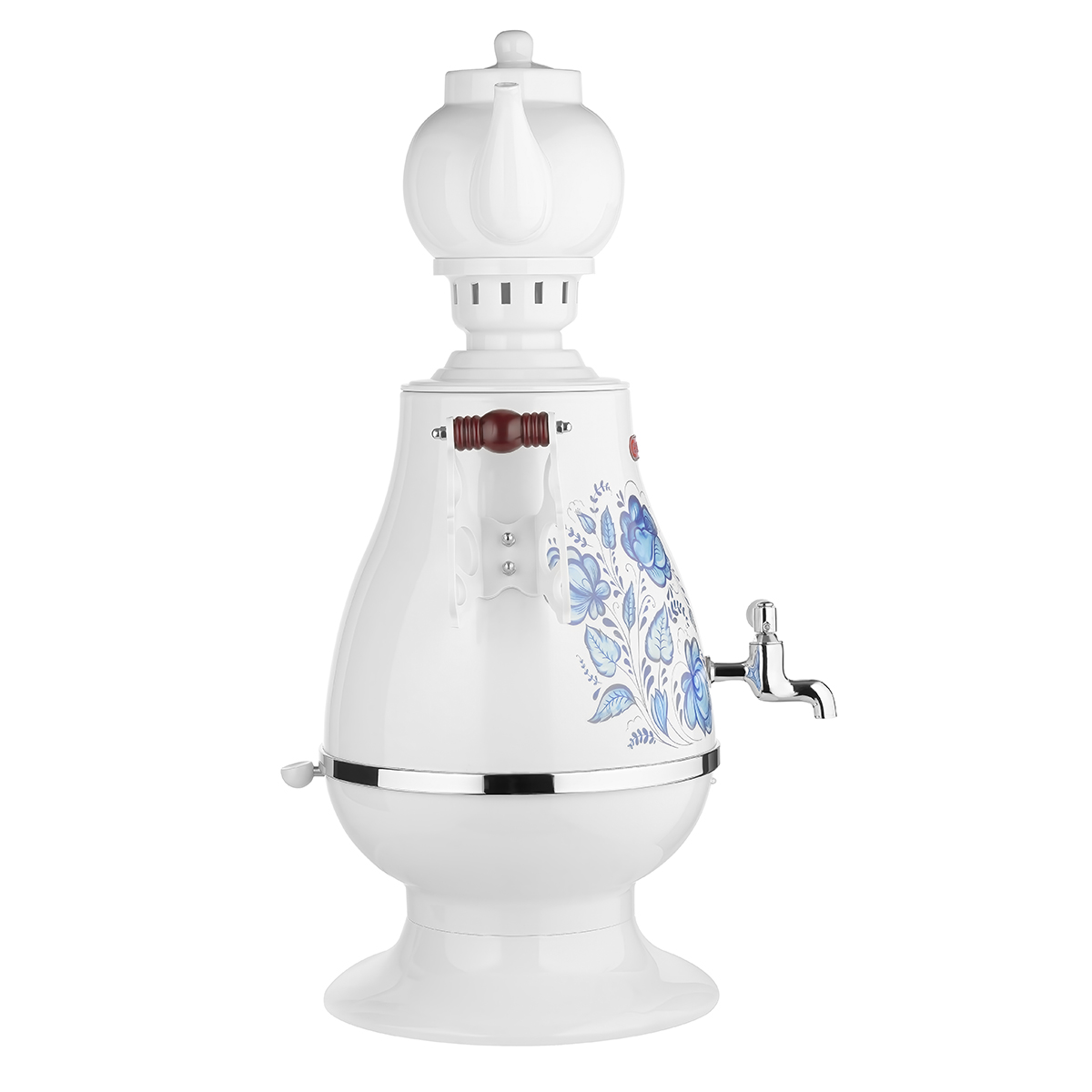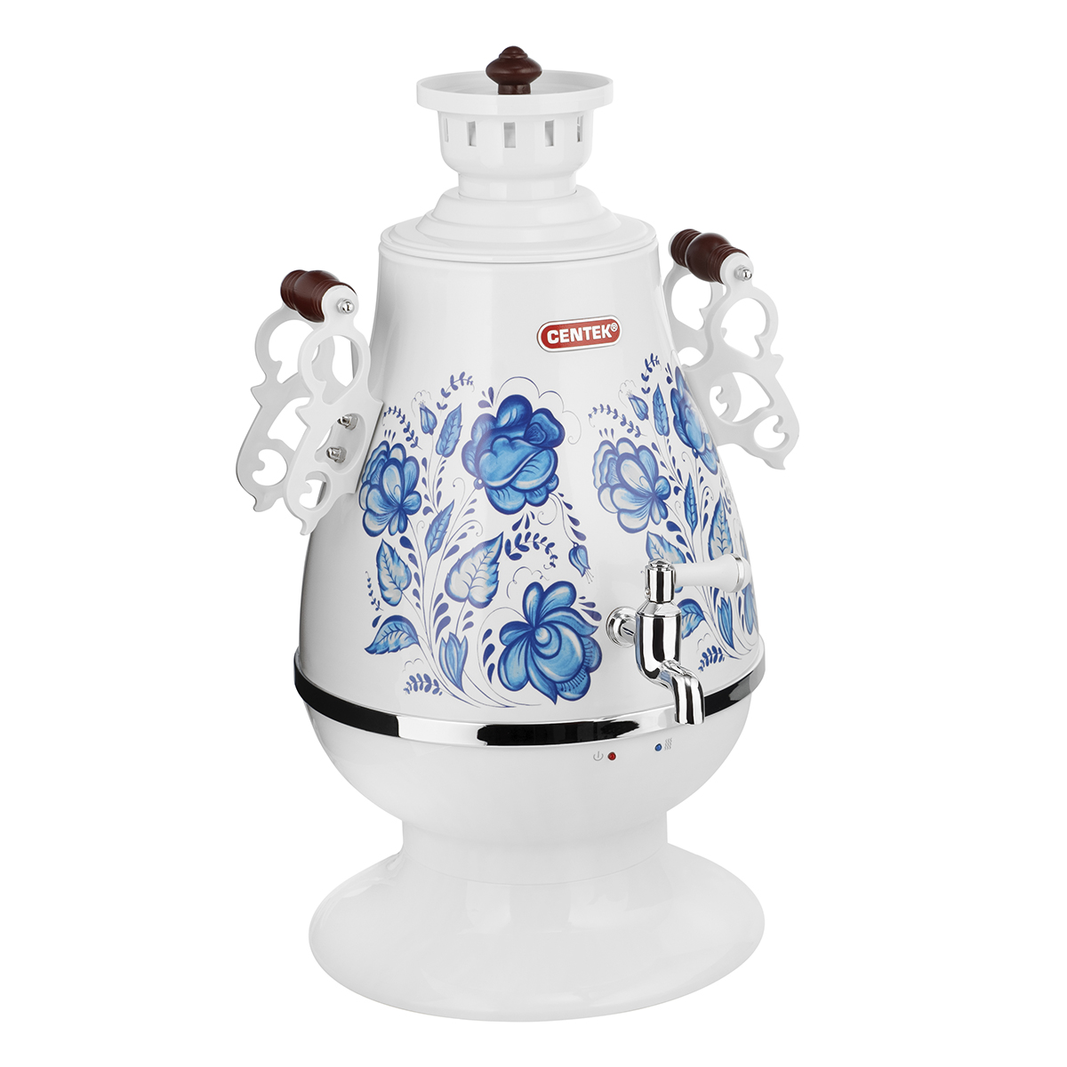 Самовар Centek CT-0091 – оригинальное, качественное и надежное изделие объемом 4 литра и мощностью 2100 Вт, которое кипятит воду за несколько минут. Скрытый нагревательный элемент дает ряд весомых преимуществ перед моделями с открытой спиралью. К ним относятся: увеличенная теплоотдача, более быстрый нагрев воды и меньшая склонность к образованию накипи. Корпус и крышка выполнены из высококачественного материала. Удобные ручки самовара не перегреваются и не скользят в ладонях во время использования. Кран на корпусе самовара обеспечивает удобное переливание воды. Плотно прилегающая к корпусу крышка обеспечивает герметичность при закипании. Керамический заварочный чайник объемом 1 литр дольше сохраняет тепло. Съемный фильтр для заварки в комплекте. Предусмотрена функция поддержания температуры. Благодаря функции автоматического отключения вам не нужно находиться рядом с прибором во время его работы. Защита от включения без воды предупреждает поломку. Удобная кнопка включения и устойчивые ножки для комфортного и безопасного использования. LED-индикаторы работы и нагрева. Корпус с авторским дизайном. Самовар Centek CT-0091 создан для душевного чаепития в большой семье.