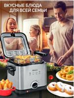 Электро прибор мощностью 1000Вт, объем чаши 1,5л, регулируемый термостат, максимальная температура 190°, антипригарное покрытие чаши для масла, фильтр для устранения запахов.