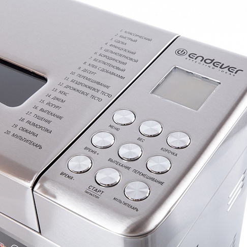 Особенности и дополнительные функции: 20 программ приготовления: Классический, Французский, Цельнозерновой, Бородинский, Быстрый, Сдоба, Безглютеновый, Хлеб с добавками, Десерт, Перемешивание, Бездрожжевое тесто, Дрожжевое тесто, Кекс, Джем, Йогурт, Выпекание, Тушение, Разморозка, Обжарка, Мультипекарь