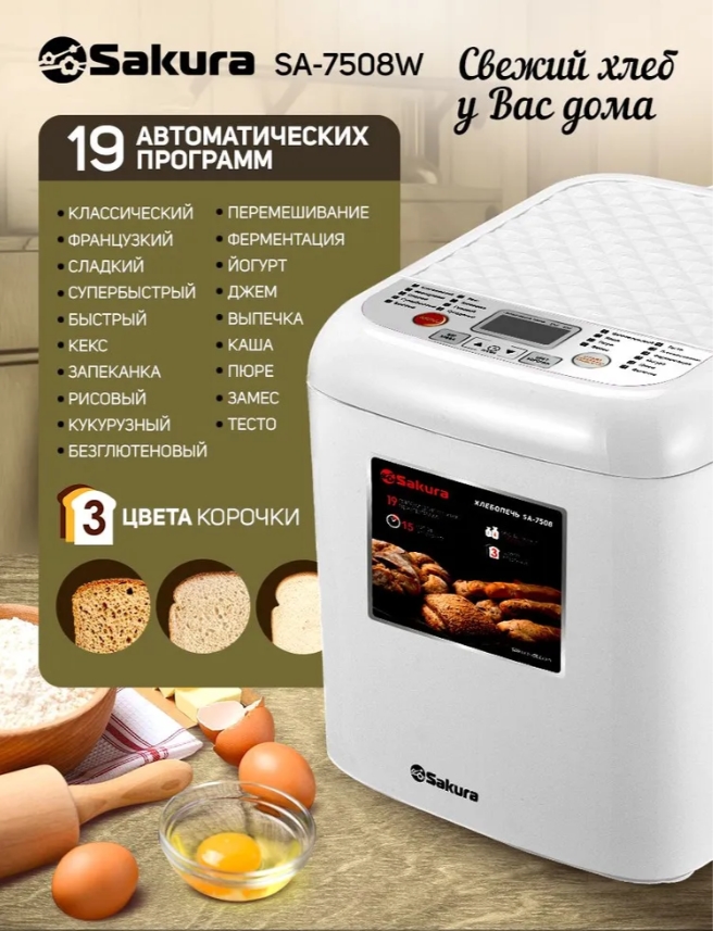 Хлебопечь SA-7508W от Sakura — это незаменимый помощник на вашей кухне. Она предназначена для приготовления свежего хлеба и других видов выпечки с максимальным удобством и простотой.