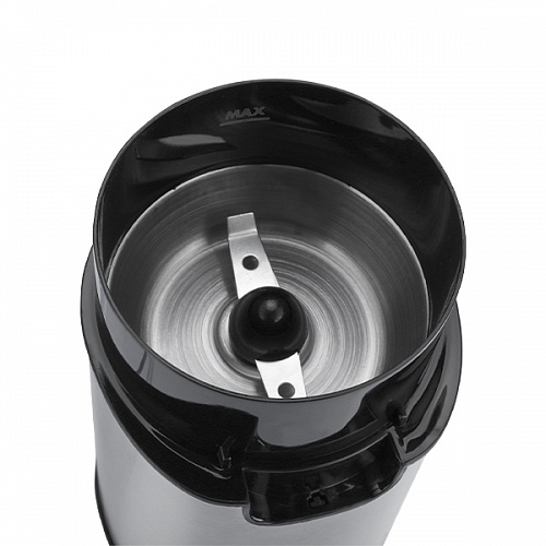 Кофемолка в корпусе с отделкой нержавеющей сталью,  загрузкой до  60 г , защитой от включения при открытой крышке и отсеком для сетевого шнура.