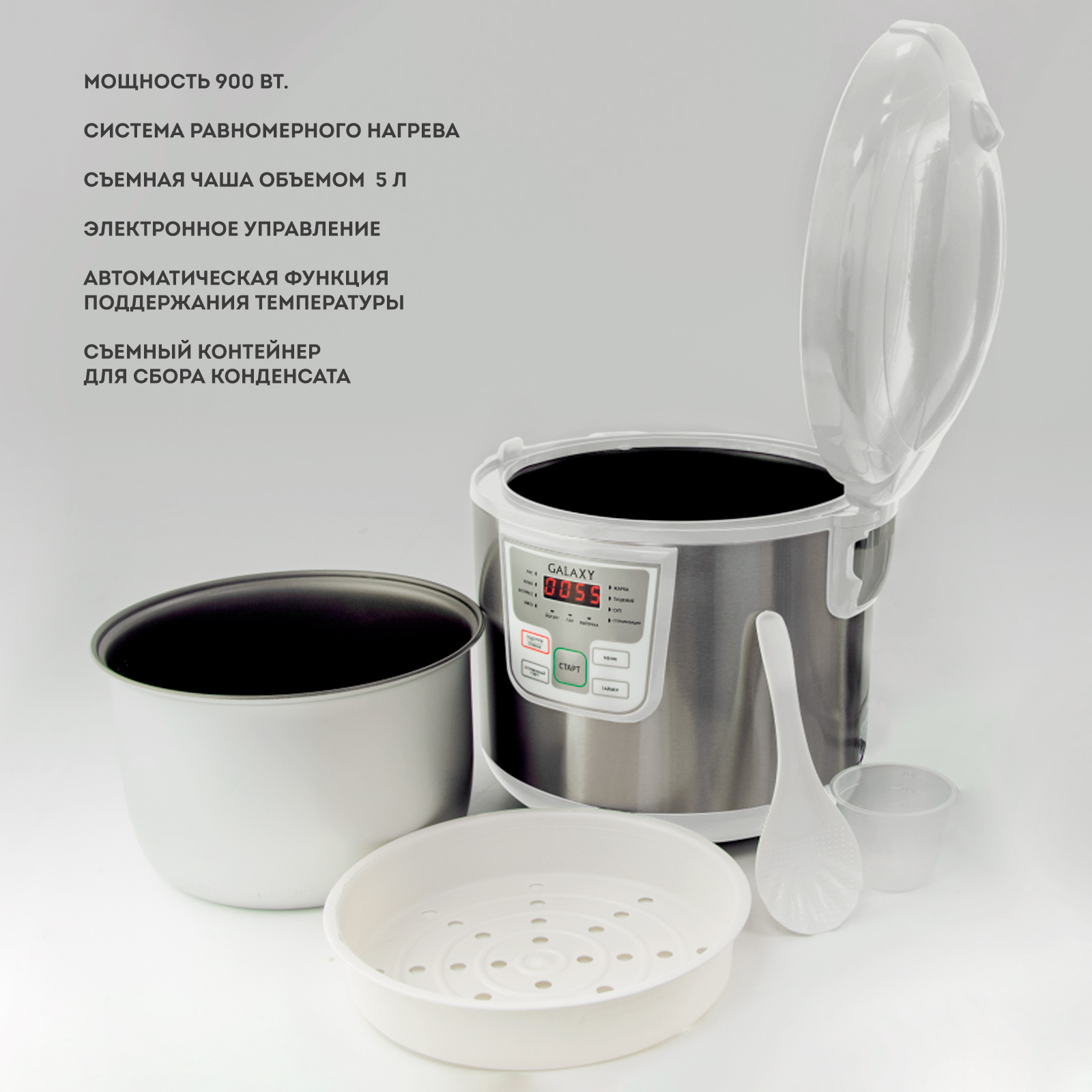 Модель GALAXY GL2641 имеет электронное управление, светодиодную подсветку дисплея, клапан для выпуска пара, равномерный нагрев, ёмкость для сбора конденсата.
