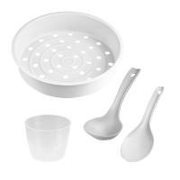 В комплекте: Съёмный контейнер для сбора конденсата, съемная чаша, емкость для приготовления на пару, ложка, мерный стакан, половник, шнур питания