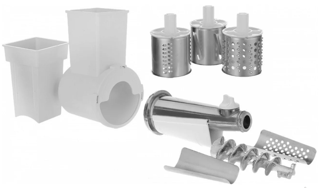 Комплект приставок АМ 11.02. Комплект приставок АМ 11.02 к электромясорубкам (ко всем моделям кроме М61, М62, М641, М642). Состоит из: приставка-соковыжималка АМ11.04, приставка-овощерезка АМ11.03-04 (4 барабана). Цвет белый, оранжевый